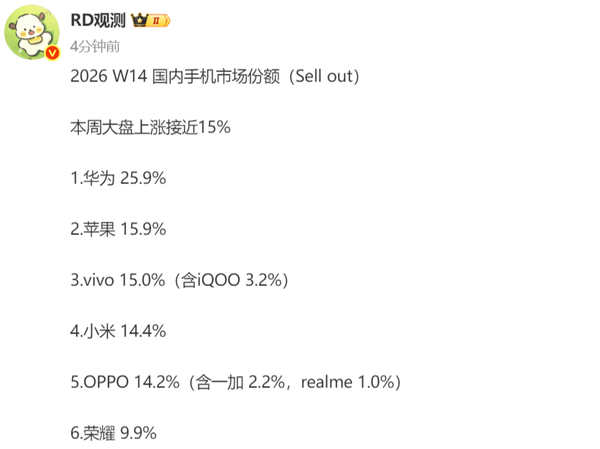 【CNMO科技消息】4月10日,CNMO注意到,博主“RD观测”公布2026年第14周中国智能手机市场的出货量份额排名: